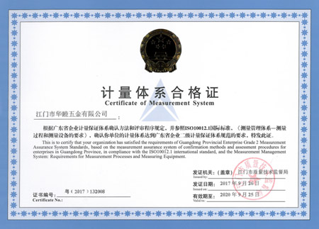 2017年9月26日,本公司之公司江門華津金屬制品有限公司(以下簡稱“華津”)及江門市華睦五金有限公司(以下簡稱“華睦”)分別通過了廣東省企業(yè)二級計量保證體系的審核,并收到由江門市質(zhì)量技術(shù)監(jiān)督局所頒發(fā)的《計量體系合格證書》(證書編號分別為:粵(2017)132009 號及粵(2017)132008 號)。